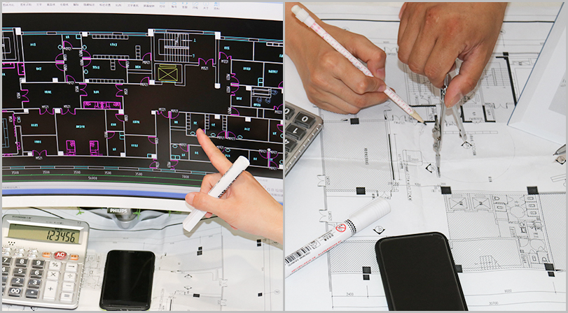 每承接一個工程,公司都會派出經(jīng)驗豐富的技術(shù)團(tuán)隊上門勘察、實地測量,提供工程設(shè)計方案。測量各個房間尺寸及造型情況,做好記錄,做到心中有數(shù)。